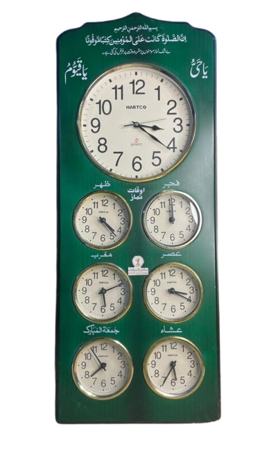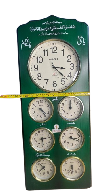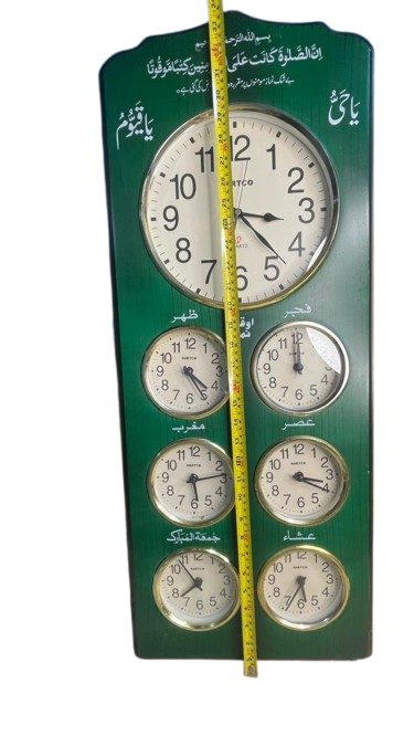 ساعة جدارية خشبية مخزنة بحالة ممتازة يحمل تواقيت الصلوات بارتفاع 86 سم والعرض 34 سم شغال % 100