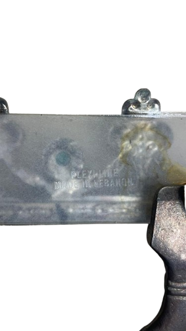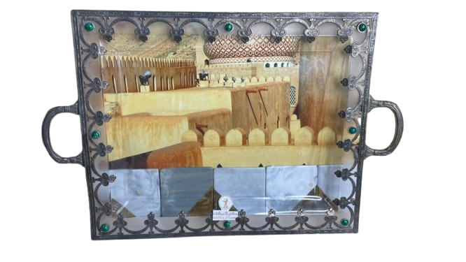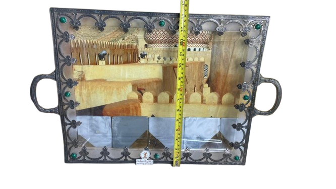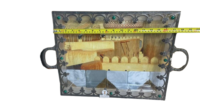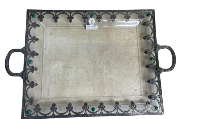 صينية قديمة شفافة مخزنة بحالة ممتازة مزخرفة من الاطراف بنقوش زهور الزئبق مع مقابض معدنية بارتفاع 36 سم والعرض 45 سم صناعة(لبنان)